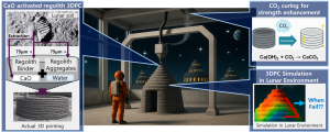 In this study, we aim to develop a novel type of lunar concrete that differs from previously proposed materials by using calcium oxide (CaO)—a substance expected to be readily available in the lunar environment—as an activator. This approach focuses on enabling the solidification of lunar concrete under ambient conditions without the need for external heating. Furthermore, recognizing the extreme and hazardous nature of the lunar environment, where human involvement in on-site construction is highly limited, this research also explores the application of 3D printing construction (3DPC) technology as a means of automated building. To improve the buildability and structural integrity of the 3D printable lunar concrete, we are concurrently investigating the incorporation of blast fibers, which are known to be present in lunar regolith, as a reinforcement material. Through this approach, we aim to advance the development of practical and sustainable lunar construction technologies based on local resource utilization.